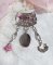 J’ai appliqué des cabochons ronds dans les nuances de Crystal AB et Fuchsia Cristal Swarovski à laquelle s’ajoute des pendants avec une clochette Rose Pink verre, une breloque charme en forme de fleur, un pendentif ovale verre représentant un visage de femme aux cheveux longs bouclés portant un bouquet de roses, des intercalaires gouttes métal, une toupie Opaque Rose Argenté et coupelles filigranées.